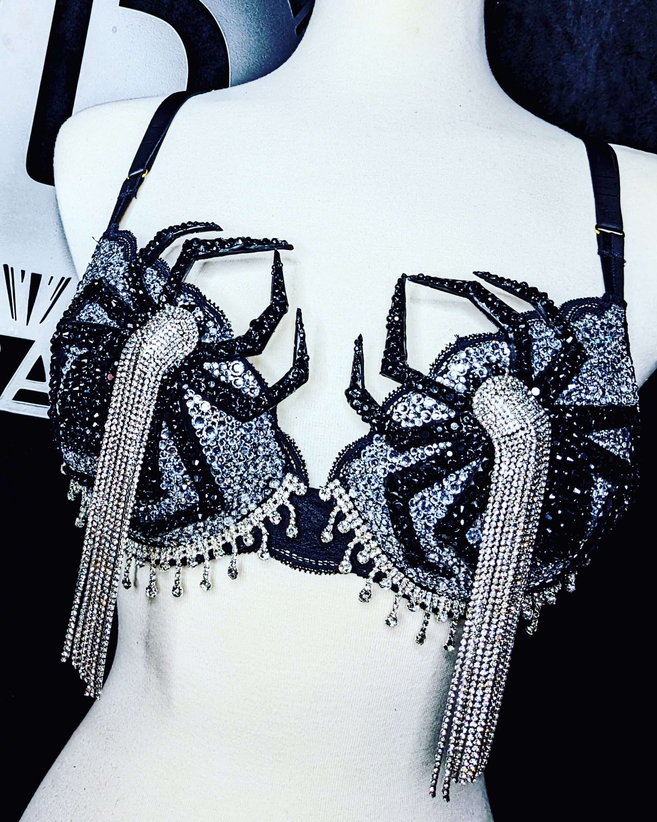 A one-of-a-kind creation inspired by Elvira’s iconic style, this custom spider top is adorned with shimmering crystals for a dramatic, gothic sparkle. Handcrafted to order, each piece is designed to capture dark glamour with a touch of enchantment. Perfect for performances, cosplay, or anyone ready to weave a little spooky magic into their wardrobe.